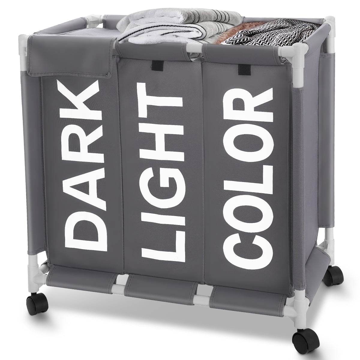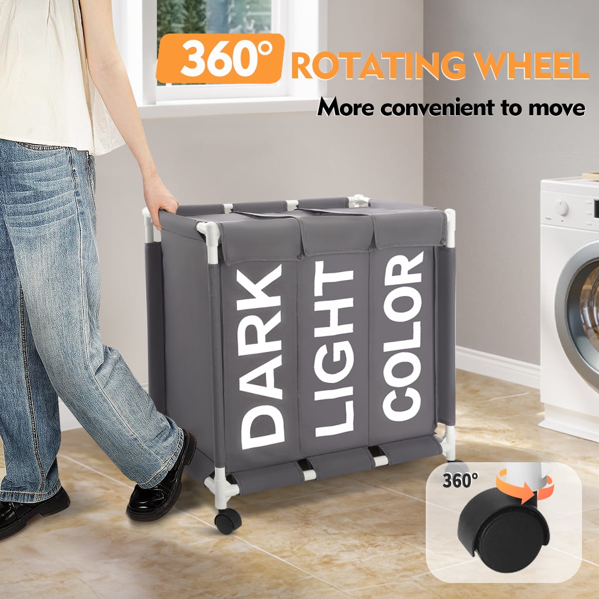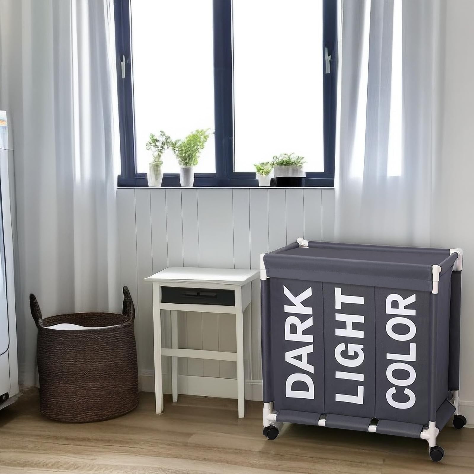 3 Section Laundry Sorter, Laundry Hamper Basket with Rolling Wheels, Laundry Organizer Cart for Bathroom Bedroom Nursery. This laundry basket sorter can help you turn chaos into clean and tidy. It can meet all your needs. Not only a dirty clothes hamper, but also a storage basket for toys, books, groceries, etc. So you can feel happy everyday and have more time to spend with your family.